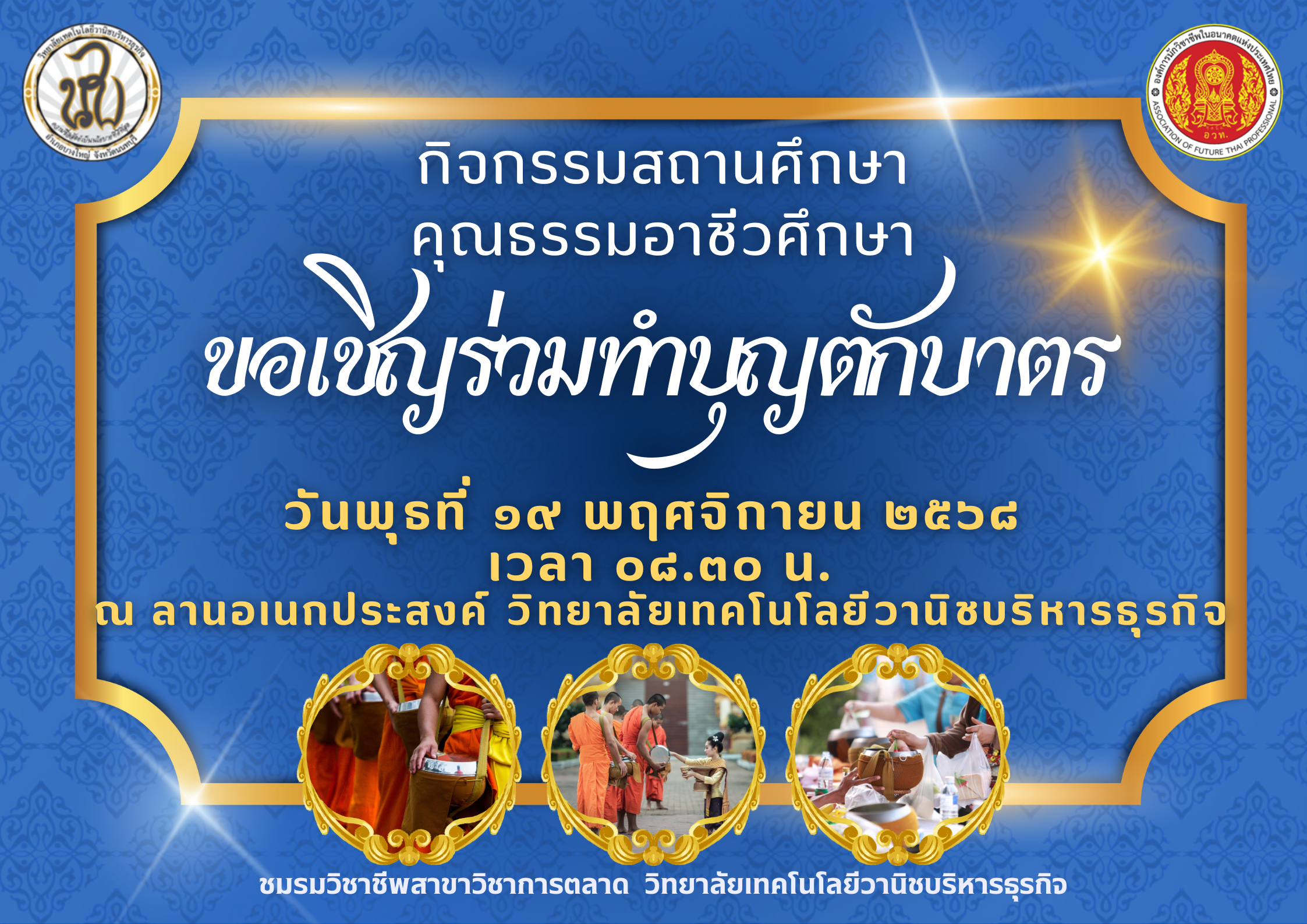 ด้วยทางชมรมวิชาชีพ สาขาวิชาการตลาด วิทยาลัยเทคโนโลยีวานิชบริหารธุรกิจ  ได้ดำเนินงานกิจกรรมทำบุญตักบาตร ภายใต้กิจกรรมสถานศึกษาคุณธรรมอาชีวศึกษา ประจำภาคเรียนที่ 2 ปีการศึกษา 2568